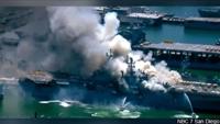 The Navy says a fire raging aboard a docked U.S. warship has moved away from fuel tanks, easing the threat of an explosion or a million-gallon oil spill in the San Diego harbor.