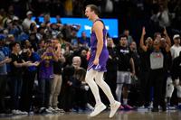 Los Angeles Lakers guard Luke Kennard celebrates after his winning basket during the second half of an NBA basketball game against the Orlando Magic, Saturday, March 21, 2026, in Orlando, Fla.