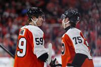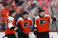 Philadelphia's first goal was scored by 19-year-old sensation Porter Martone, who just weeks ago starred at Michigan State and now could be a dangerous weapon in the first-round series against Pittsburgh. Martone deflected a point shot from Matvei Michkov, the 21-year-old Russian who navigated an uneven first half of the season only to heat up as the games heightened in importance down the stretch.
