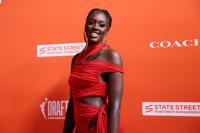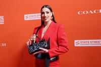 Raven Johnson debuted a bob hairdo on the orange carpet — a big change from the long hair the South Carolina guard had in a ponytail at the Final Four only a week ago. Johnson said she partnered with Coach going for a rich and elegant look in a gray and black jacket-style dress with black clutch, diamond necklace and earrings.