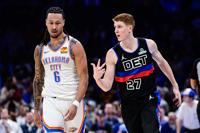 Oklahoma City (+130) is favored to win the NBA title, according to BetMGM Sportsbook, followed by San Antonio (+450), Boston (+550), Denver (+1000), Cleveland (+1300) and New York (+2000). Detroit, the No. 1 seed in the East, is +2000. The Los Angeles Lakers were +2500 before Luka Doncic and Austin Reaves got hurt; they're +20000 now.