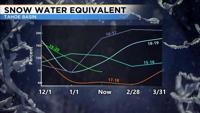 Speaking of the cold, temperatures will only be in the 30’s Monday and Tuesday. This is about ten degrees below normal. Lows will also be in the teens. Sunday will start out alright with temperatures in the 40’s, but we’ll already be in the low 30’s by 5pm in Reno. Good news if you don’t like the cold weather, cause we’ll warm up again by the later half of the week. We could use the snow though. The rest of the blog talks about where we are with our snowpack and how warm we were in January.