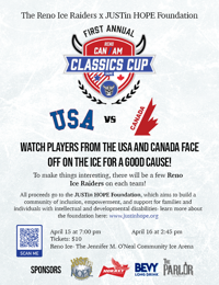 The JUSTin Hope foundation and the Reno Ice Raiders are inviting the community to the first annual CanAm Classics Cup featuring hockey players from Canada and the United States in support of autism awareness month.