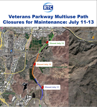 The Regional Transportation Commission (RTC) of Washoe County is planning to close sections of the Veterans Parkway multiuse pathway between South Meadows Parkway and Clean Water Way over the course of three days for routine maintenance.