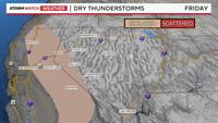 Usually, storms develop in the afternoon, but overnight storms are possible this go around too. As the ridge moves east Saturday, the storms will change direction as well. With a southeasterly flow, most of the storms will skip the Truckee Meadows on Friday, but as the flow comes more out of the southwest, storms will be able to develop in the Reno area much easier early Saturday.