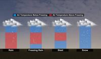 Freezing rain can be the worst to drive in and can bring down power lines too. Freezing rain occurs when the snow completely melts through a large layer of warm air. This turns the snow into rain. As the rain reaches the ground it encounters a thin layer of freezing temperatures near the surface. Which means as the rain hits the ground it freezes with contact, turning our roads into skating rinks.
