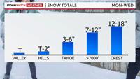 Snow totals will range from no more than a trace in Reno, to a couple inches at or above 5,000’, 3-6 inches at lake level, and 12-18 inches at the crest. Donner has a 90% chance of seeing three inches of snow, a 70% chance of seeing eight inches, and a 40% chance of seeing a foot. At the least, Mt. Rose Summit will pick up 3", but on the high end 13". The expected forecast for Mt. Rose Summit is 10 inches.