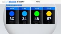 Click on the image below to view more localized day planners for Friday. The top image is for Reno, but if you click on the image below, you’ll find many more localized forecasts for areas within Reno, Carson City, and Fernley. Overnight lows vary quite a bit just outside of the airport. For more information on the Freeze Warning, click here.