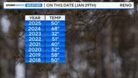 In first place, Reno saw eight days during the month of January, in the 60’s or above back in 1953, and we’re only looking at it happening one time this month. The average high for the month of January 2026 so far, is approximately 50.3 degrees, which is the 16th warmest on record. The warmest is 55.5 degrees, set back in 1948.