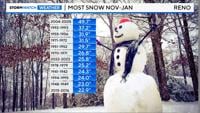 The least amount of snow ever recorded at the Reno Airport between November and January was set back in 1999-2000, when nothing fell. Our current snow season is in tenth place, with 1.50” of snow falling so far. Only an inch of snow fell between November and January in 2017-2018, taking seventh place for the least amount of snow falling at the airport.