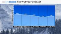 The snow level starts near 6,800 feet Tuesday morning, dropping to around 6,200 feet during the day. By Wednesday morning, snow levels reach foothill elevations, though precipitation becomes more spotty at that point.