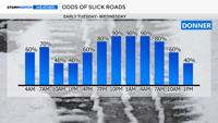 Donner Summit will be slick Tuesday morning, with improved conditions between 10 a.m. and 1 p.m. due to a higher sun angle, followed by worsening conditions into the late afternoon and overnight hours.