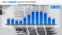 Mt. Rose Highway conditions are being affected by shadowing. Much of Tuesday may remain manageable, but conditions are expected to deteriorate by around 3 p.m., with hazardous travel continuing overnight into Wednesday morning.