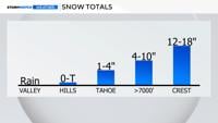 In the Tahoe Basin, a Winter Weather Advisory remains in effect through Wednesday afternoon. Heavy snow above 6,500 feet is expected, with 4 to 10 inches common at mid elevations and up to 18 inches on higher peaks. Lake level snowfall of 1 to 4 inches is possible, with the highest amounts on the western shores. In fact, the west side of Tahoe could get up to six inches of snow by Wednesday morning. Gusty winds up to 35 mph at lake level and ridgetop gusts up to 90 mph are also expected.