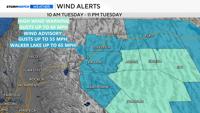 Wind Advisories are also in effect for western Nevada Basin and Range areas including Pyramid Lake, where gusts up to 45 mph are expected and lake conditions will be hazardous.Â