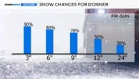 Snow chances for Donner Meteorologist Angela Schilling Apr 9, 2026 9 hrs ago Local Events KTVN Contests Live Stream Facebook Twitter WhatsApp SMS Email Print Copy article link Save Confidence is growing for Sierra snow this weekend, especially on Saturday. The snow will come in bursts, as the weather pattern will be convective like thunderstorms. Meteorologist Angela Schilling As featured on Facebook Twitter WhatsApp SMS Email Print Copy article link Save Currently in Reno 54° Mostly Cloudy69° / 44° 1 AM 53° 2 AM 51° 3 AM 50° 4 AM 49° 5 AM 48° Watch 2 News Most Popular Articles Videos ArticlesCrash in Fallon area kills one, injures twoTick bites increasing in northern Nevada in pets and humansReno Police warn of new text scam making the roundsApril snow storm will lead to travel delays this weekend, a closer look at the forecastPolice respond to reported armed robbery at Harvard Way apartment complexFire crews fight fast moving brush fire in west RenoThe world's oldest octopus fossil isn't an octopus after all, scientists sayEarly morning house fire in Dayton under investigationReno Firefighters put out blaze at home near Teglia's Paradise ParkPlacer County deputies help rescue injured bald eagle Videos {{title}} {{summary}} Notifications Settings You don't have any notifications. Get up-to-the-minute news sent straight to your device. Topics Breaking News Subscribe