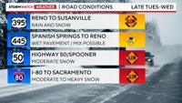 Conditions will improve late Wednesday, but watch out for icy spots along our mountain passes Wednesday night. The snow itself will be done by 11pm and heavier south of I-80 in Mono County.
