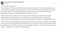 Winnemucca Police Department Apr 3, 2023 Apr 3, 2023 Updated Apr 3, 2023 Facebook Twitter WhatsApp SMS Email Print Copy article link Save As featured on +5 Lockdown Lifted at Damonte Ranch High School After Possible Threat 'Police have investigated and determined the threat to be false,' WCSD says on its website. Facebook Twitter WhatsApp SMS Email Print Copy article link Save Currently in Reno 57° 61° / 34° 7 PM 55° 8 PM 52° 9 PM 50° 10 PM 50° 11 PM 48° Watch 2 News Most Popular Articles Videos Articles200+ aftershocks reported after magnitude 5.7 quake strikes southwest of FallonElko airport reopens after shooting leaves father, son dead in apparent murder-suicideReno Police say missing man found safe, returns homeState moves to close two prison camps as strategy shiftsAuthorities warn tax scams are ramping up as filing season beginsSparks Police asking for help finding runaway teenage girlAttorney General Aaron Ford announces settlement with Norwegian Cruise LineAs a community mourns loss of its Sheriff, Churchill County leaders prepare for the next chapterStorm brings slick conditions and chain controls to the regionFlorida teenager charged with sexually assaulting and killing stepsister Anna Kepner on cruise ship Videos {{title}} {{summary}} Notifications Settings You don't have any notifications. Get up-to-the-minute news sent straight to your device. Topics Breaking News Subscribe